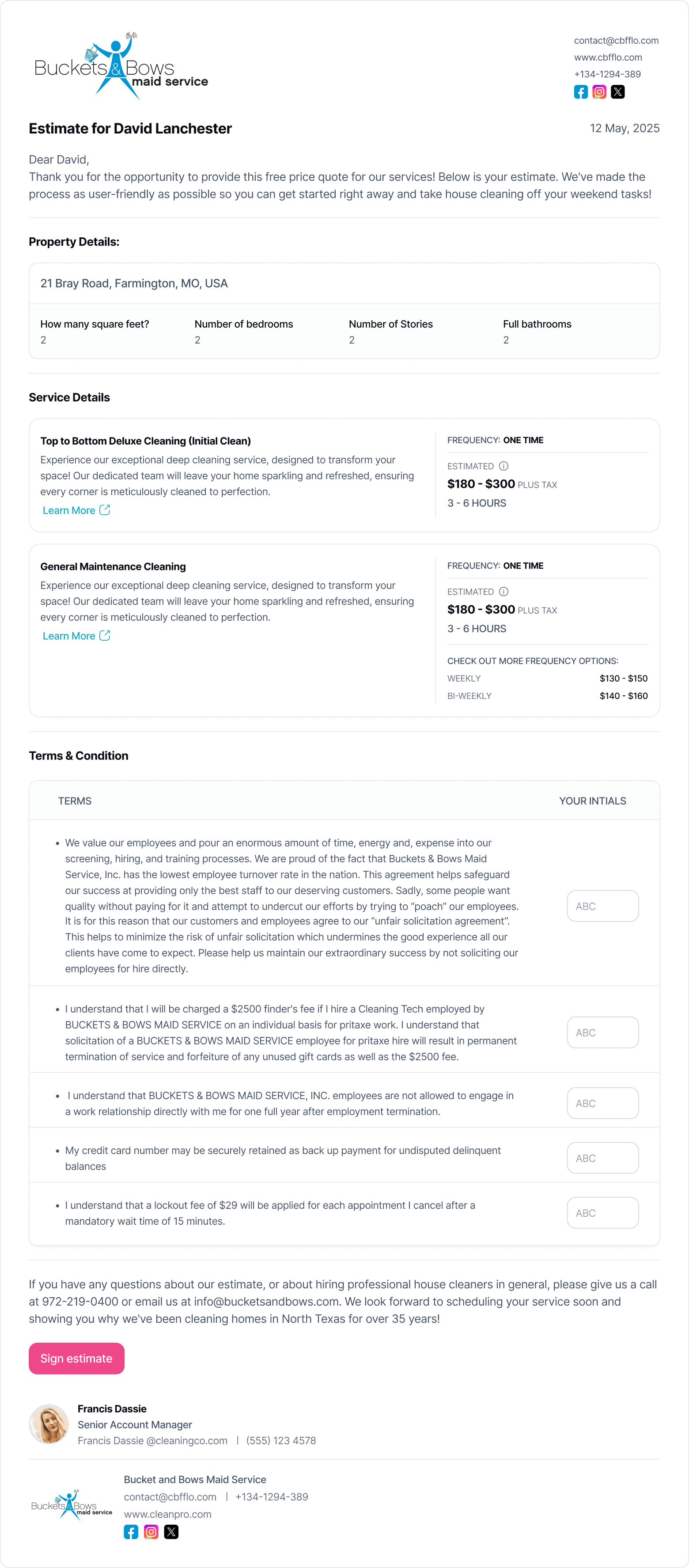 Now, instead of doing everything over the phone, estimates go straight to the client’s email. They can review, add bank info, and sign securely at their own pace. No awkward calls and fewer errors.