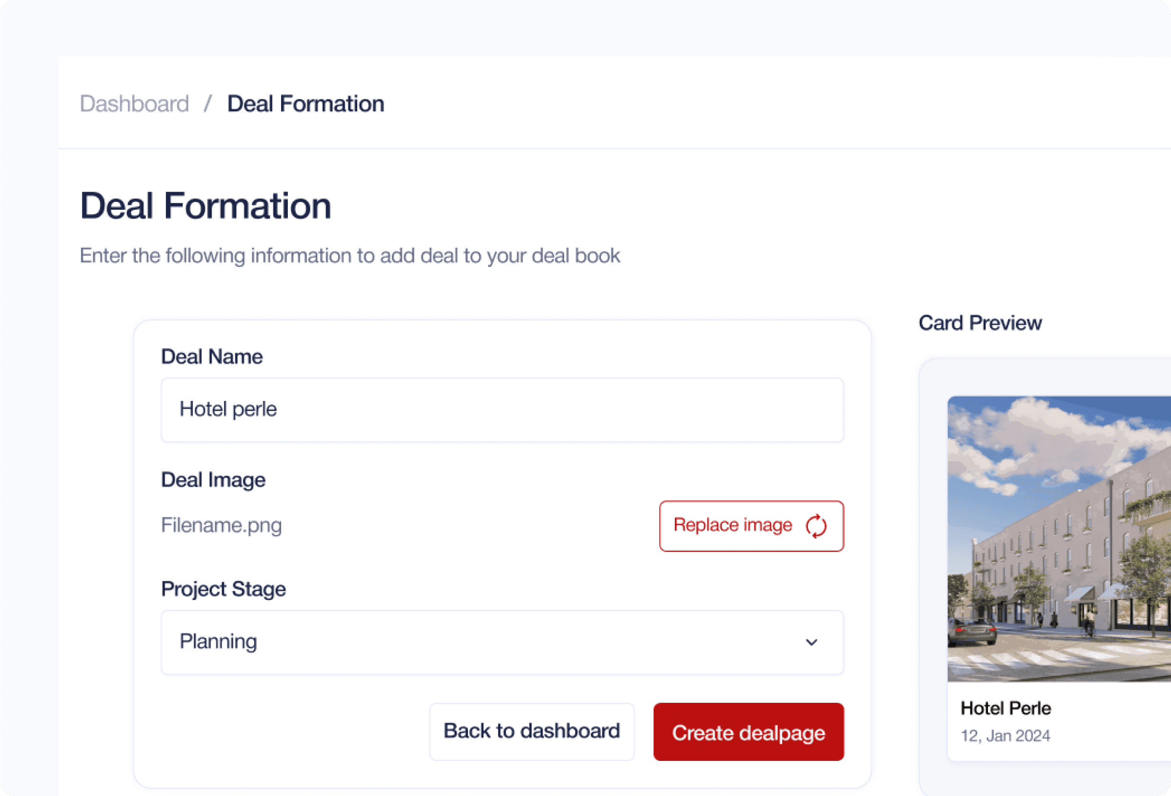 To speed up deal creation, the product can generate a first draft of a deal page from voice input and uploaded assets.This reduces setup time while keeping the final structure consistent.