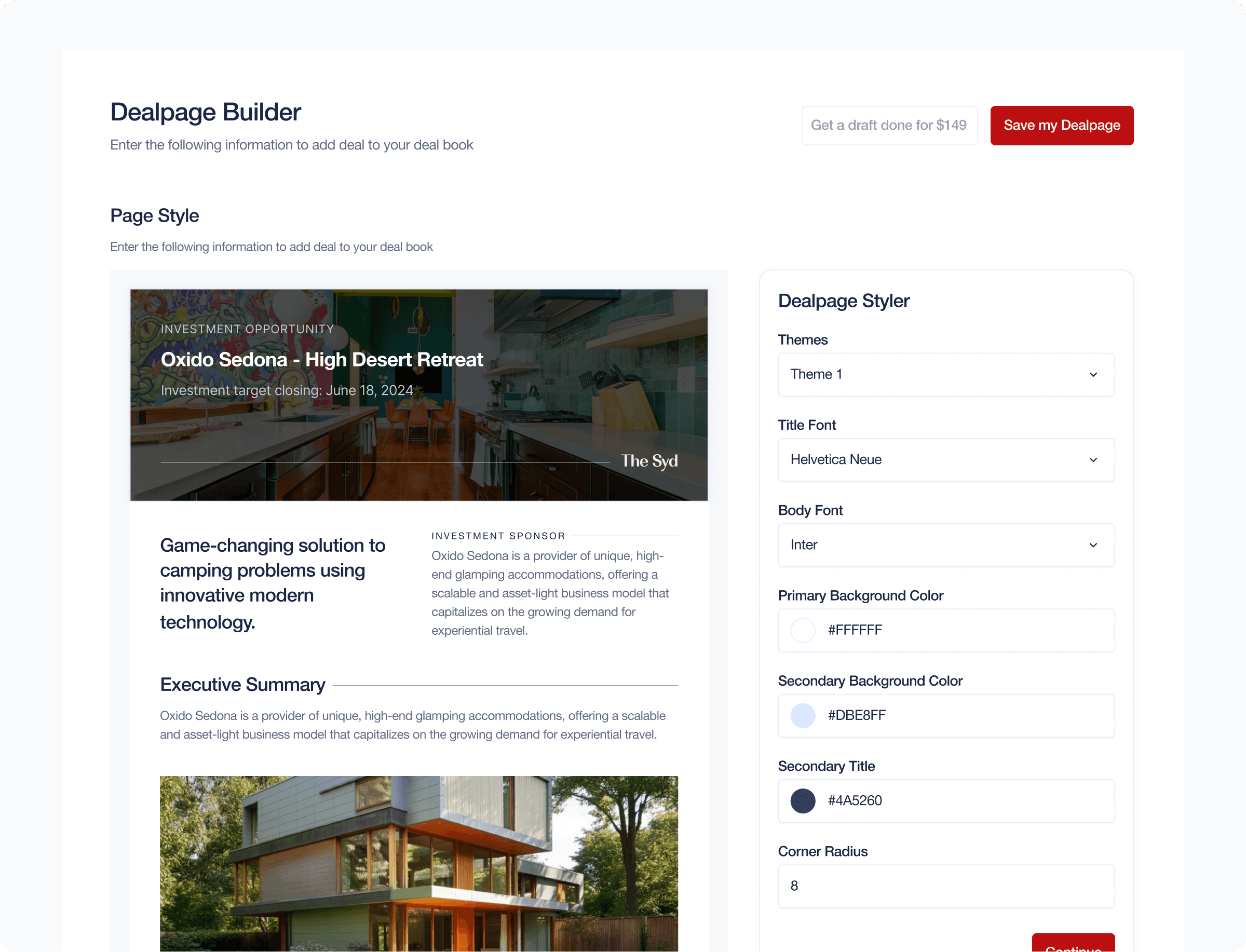 Once a deal exists, developers turn it into a page they can share with investors.