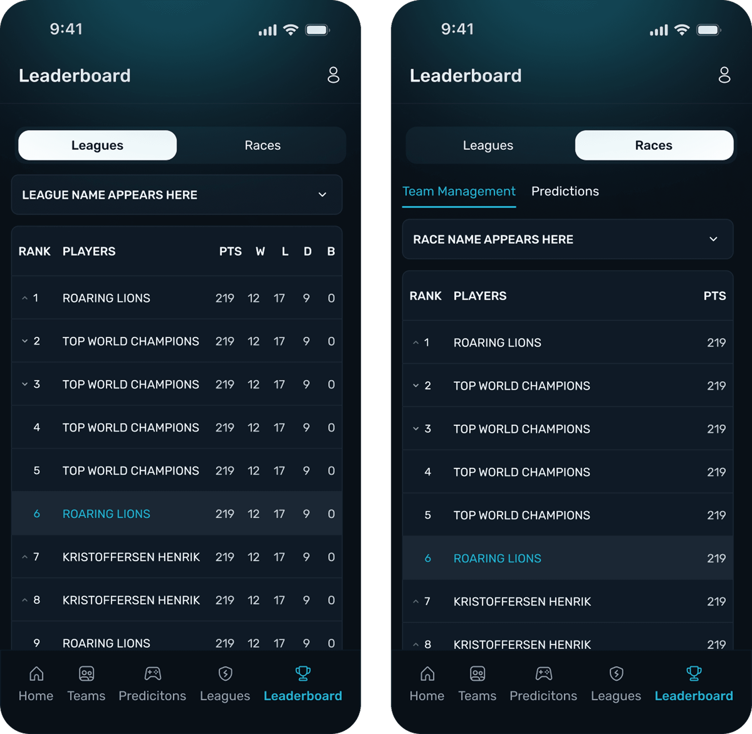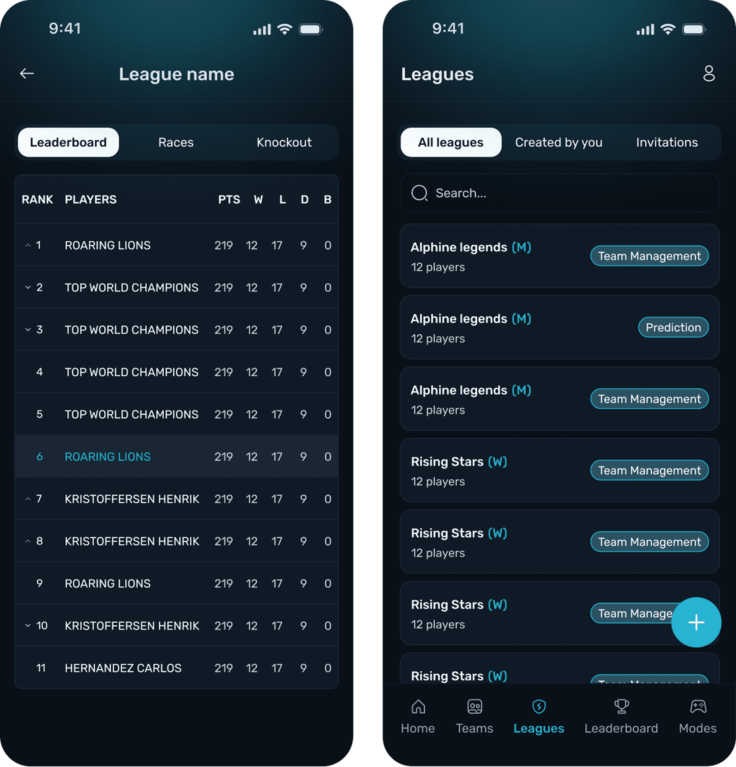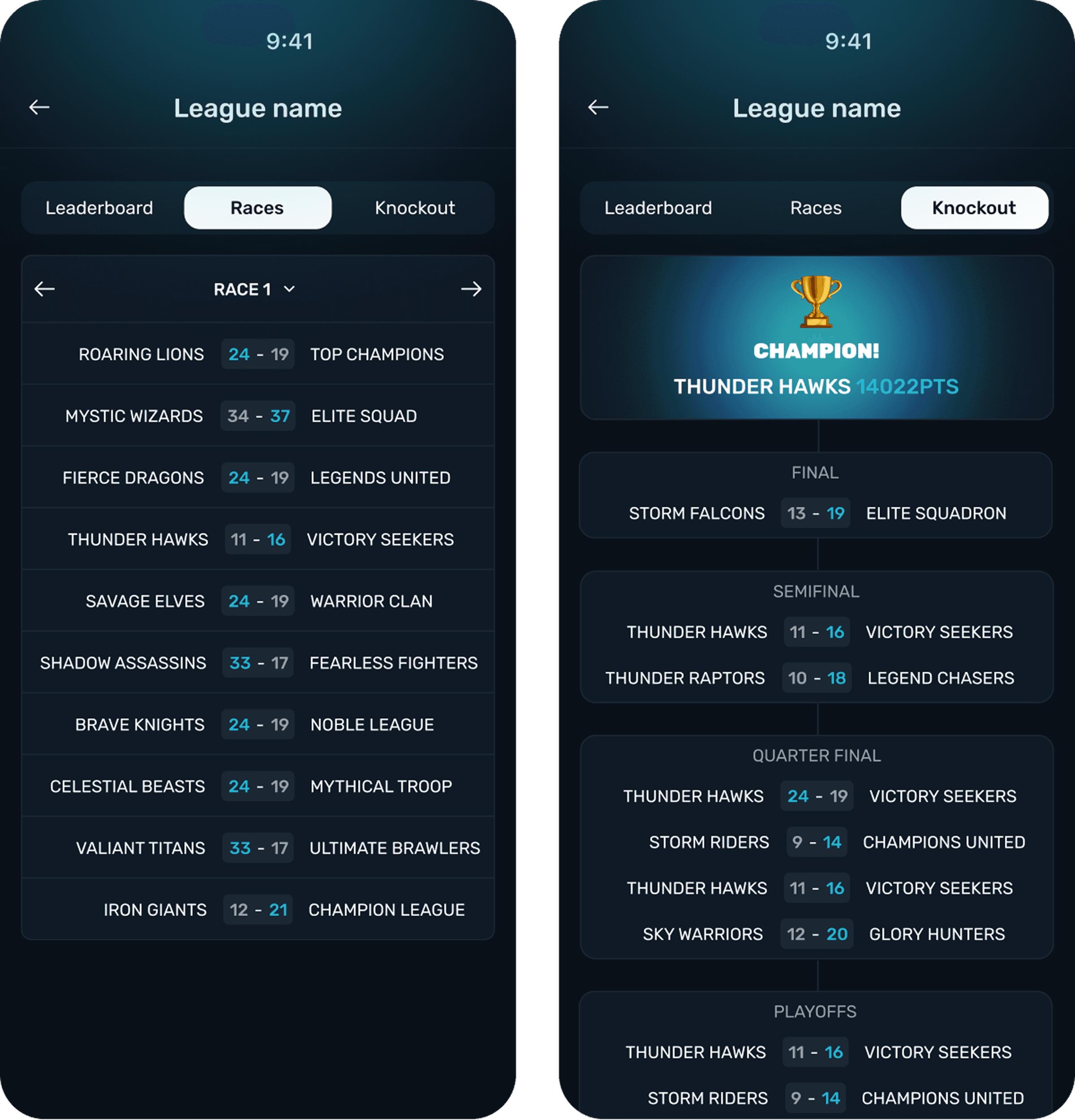 Now: I reorganized the league experience around how people actually think about leagues. You start with a simple list of all your leagues. Inside a league, information is grouped into clear sections: standings, races, and knockouts. Each section answers one question at a time, so it’s easier to follow progress and understand your position without feeling overwhelmed.