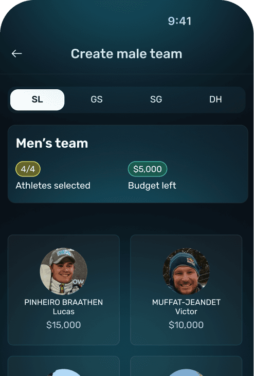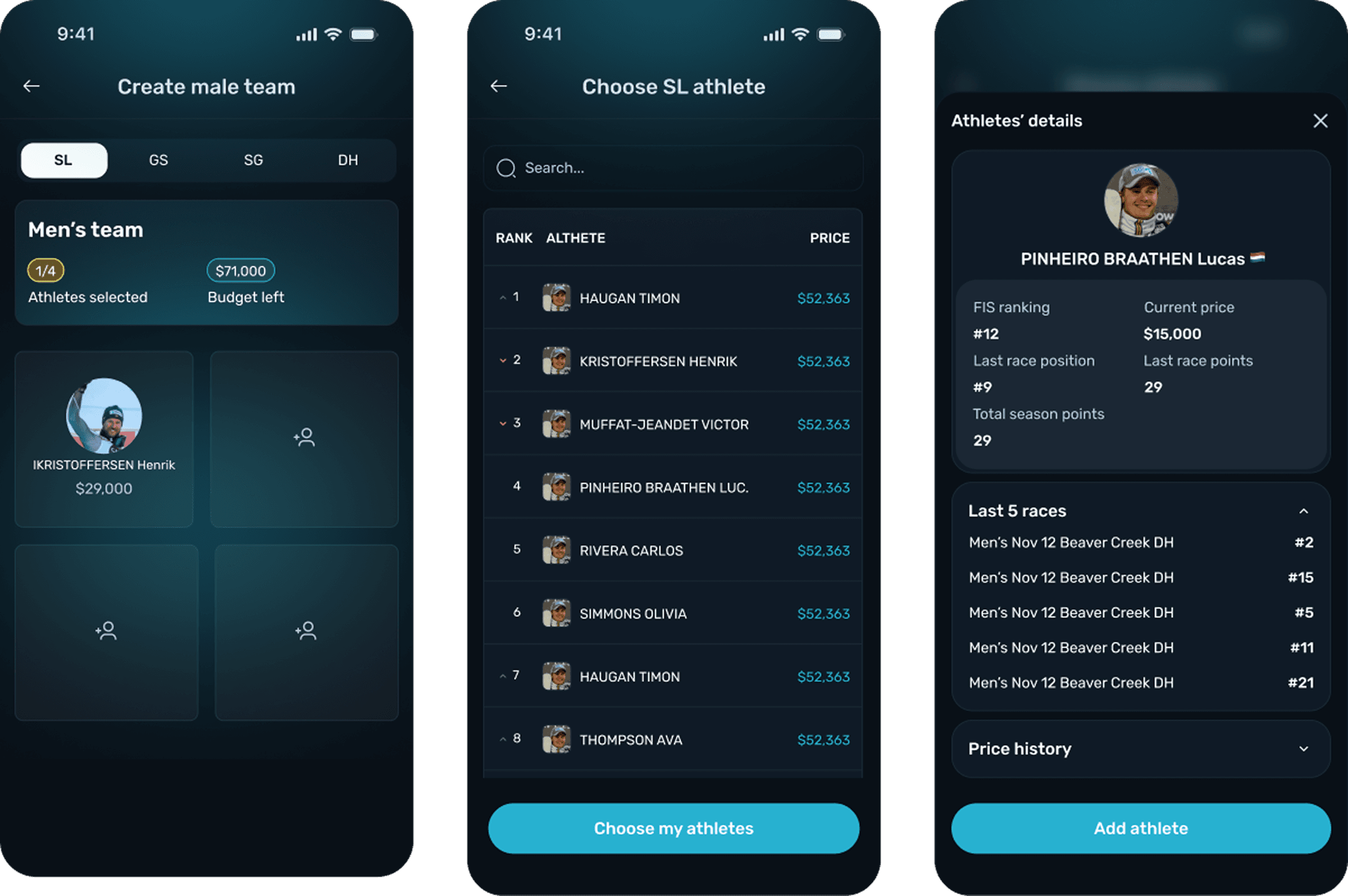 Now: I slowed this part down and gave each choice more context. Team creation is split by discipline, with a clear budget tracker and visible slots for each athlete. When you tap a player, you can actually see who they are, how they’ve been performing, and how their price has changed before committing.