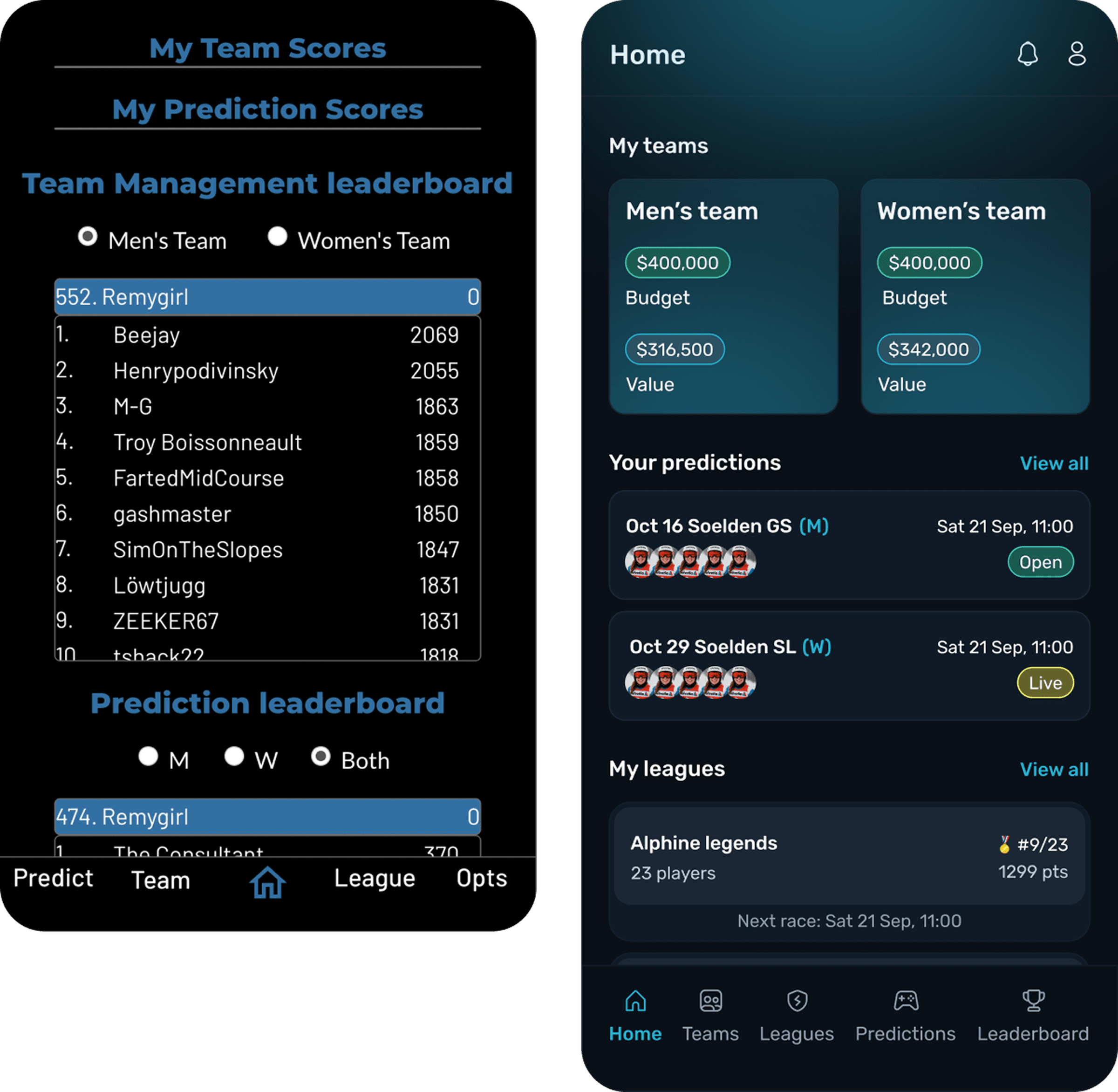 Skiing is niche and unfamiliar to most people, including me. The existing app felt outdated, and key flows like team setup, predictions, and leagues were hard to follow. That friction narrowed who could realistically use the product, which in turn limited growth and revenue potential for the company.